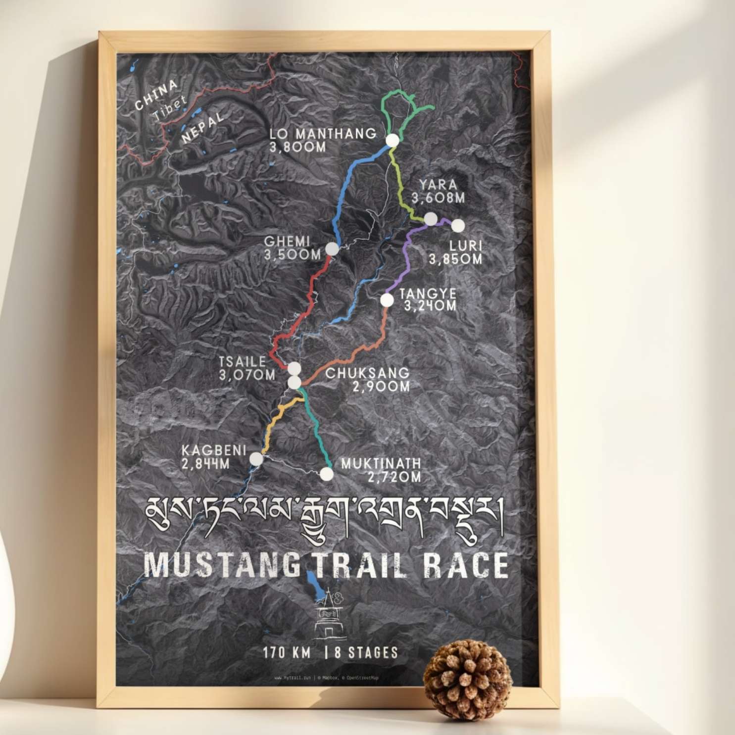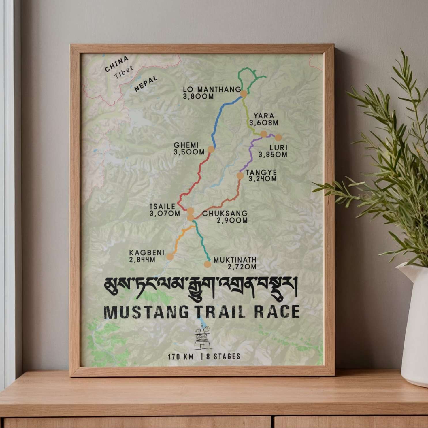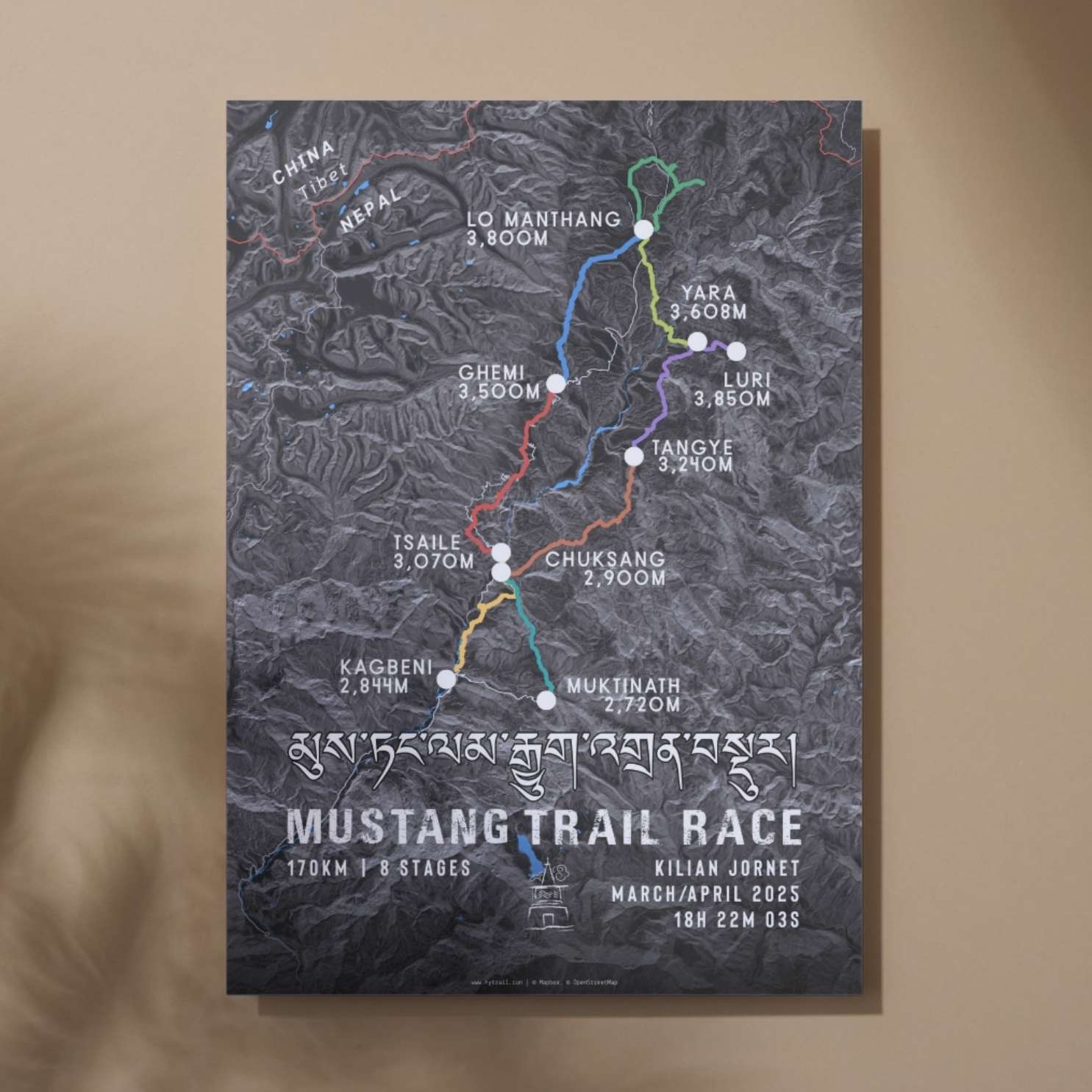 Celebrate your extraordinary achievement in the heart of the Himalayas with this stunning Mustang Trail Race route map poster. Designed for finishers of Nepal's premier high-altitude ultramarathon, this detailed cartographic artwork captures every kilometer of your 170km journey through the trans-Himalayan region's most dramatic landscapes.