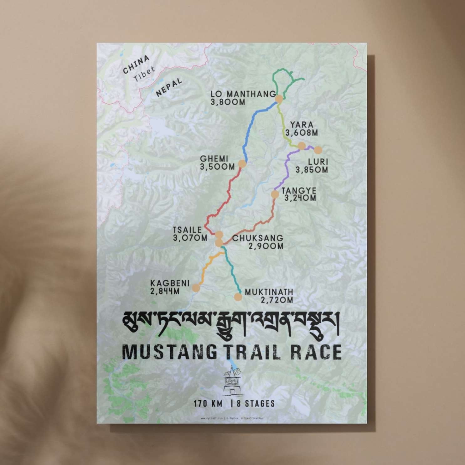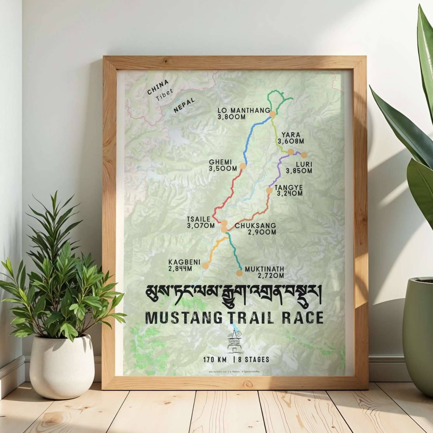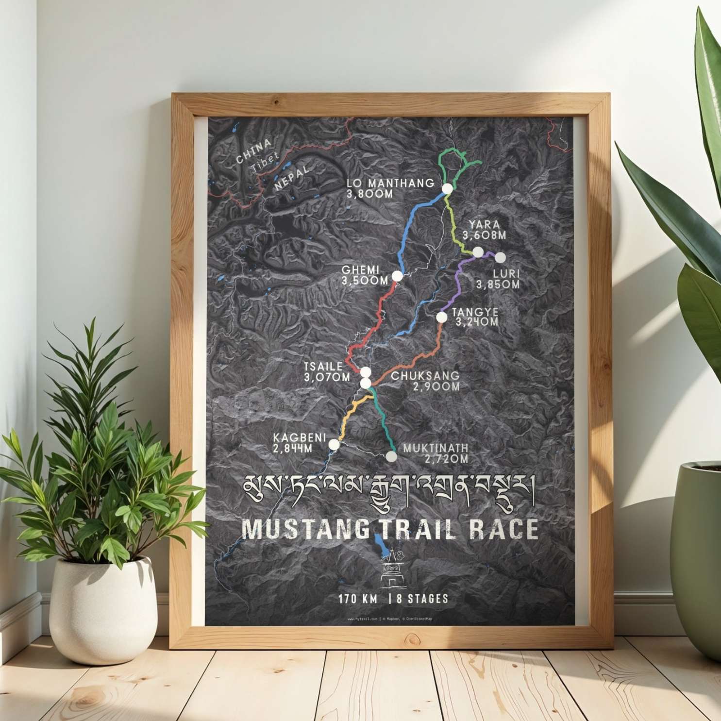 Celebrate your extraordinary achievement in the heart of the Himalayas with this stunning Mustang Trail Race route map poster. Designed for finishers of Nepal's premier high-altitude ultramarathon, this detailed cartographic artwork captures every kilometer of your 170km journey through the trans-Himalayan region's most dramatic landscapes.