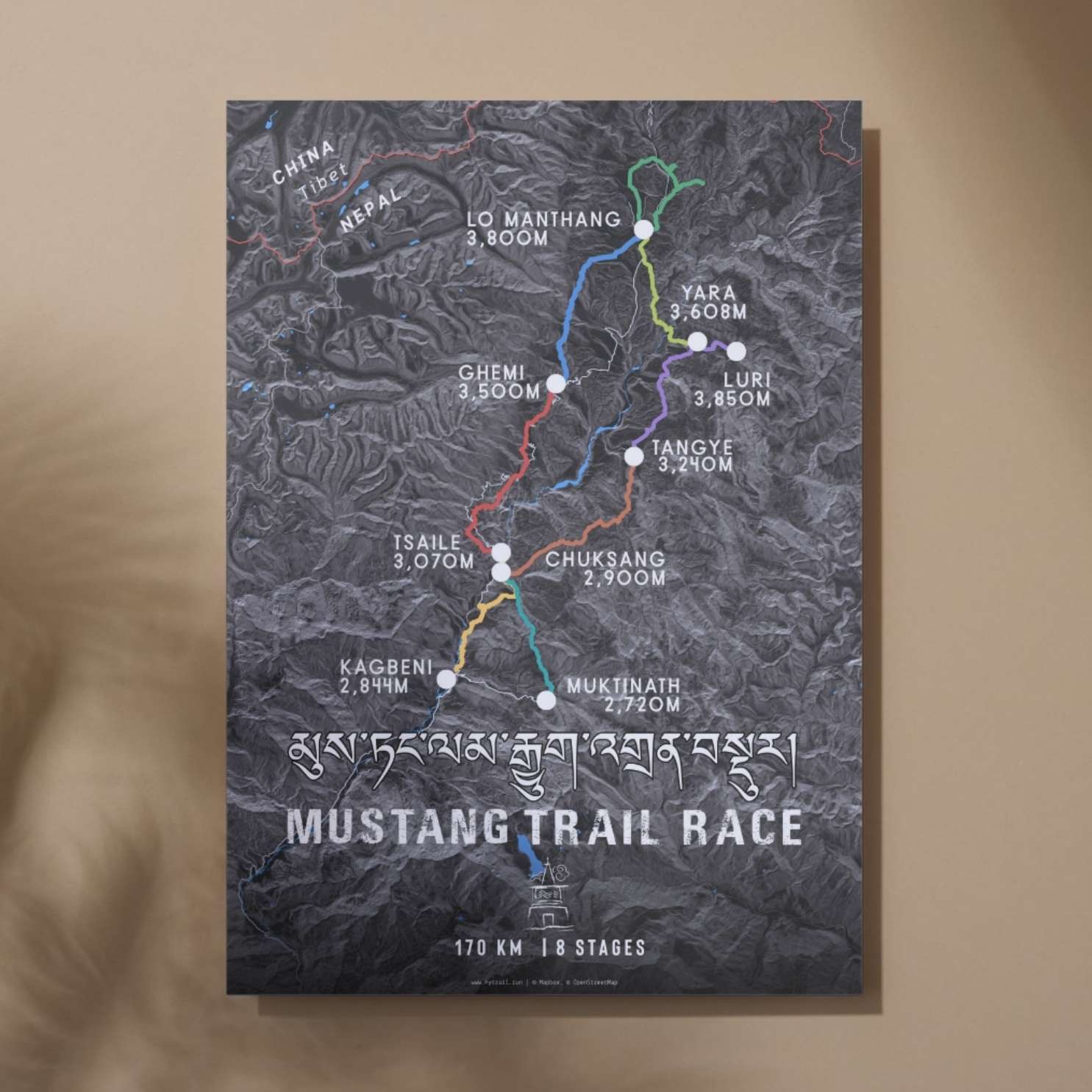 • A Data-Rich Art Piece: The 8-stage, 170km Mustang Trail Race route is highlighted across a detailed topographic base map.